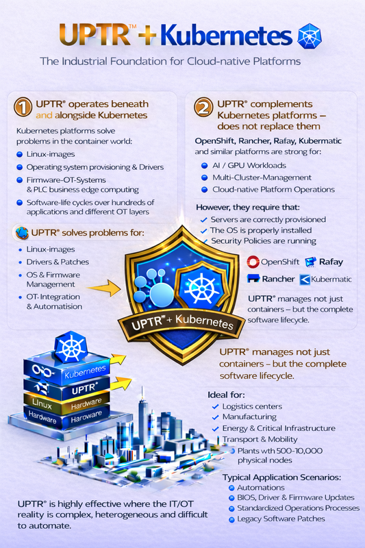 While large Kubernetes platforms like OpenShift or Rancher address the orchestration of Kubernetes clusters, UPTR™ automates the entire technical infrastructure that actually exists in industrial, logistics and critical infrastructure environments: heterogeneous systems, physical servers, edge devices, software versions, security, provisioning and lifecycle management.